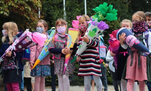 Maske auf, Maske ab– das ist jetzt Alltag an Bayerns Schulen. Und das haben die Erstklässler wie hier in Marzling im Landkreis Freising schon am ersten Schultag gelernt. Auf dem Schulhof sind die lästigen Tücher vor Mund und Nase Pflicht. Im Unterricht dürfen sie die Masken aber ablegen. Foto: Raine