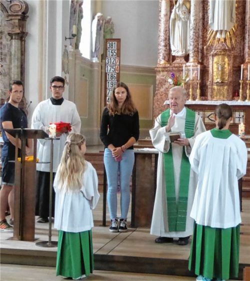 Zur Freude der Pfarrei Bruckmühl wurden zwei neue Ministrantinnen in der Kirche Herz Jesu eingeführt: Amelie Dörnberger und Theresa Pachner erhielten dabei von Pfarrer Matthias Bartl den Segen für den Ministrantendienst und von den Oberministranten Dominik Fuchs, Evelyn Garnreiter und Maxi Rumpel ih