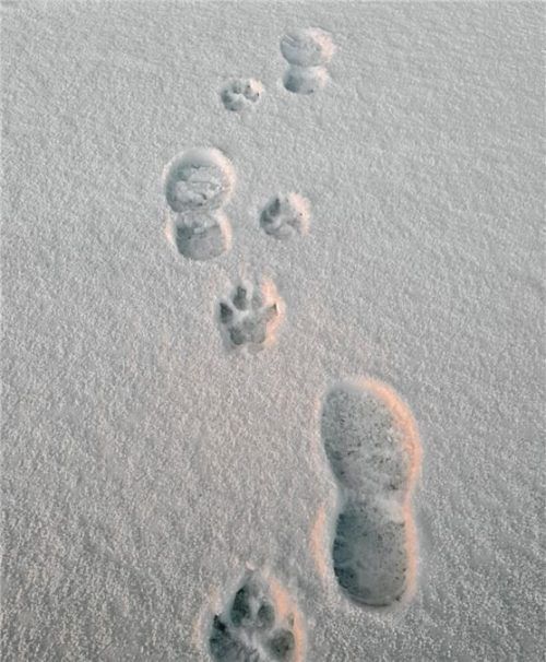 Ein Herz und eine Seele sind hier Hund und Hundebesitzer. Ihre Spuren im Mangfalltal verschwimmen zu einem gemeinsamen Paar – eine Pfote und ein Schuh. Foto Ammelburger