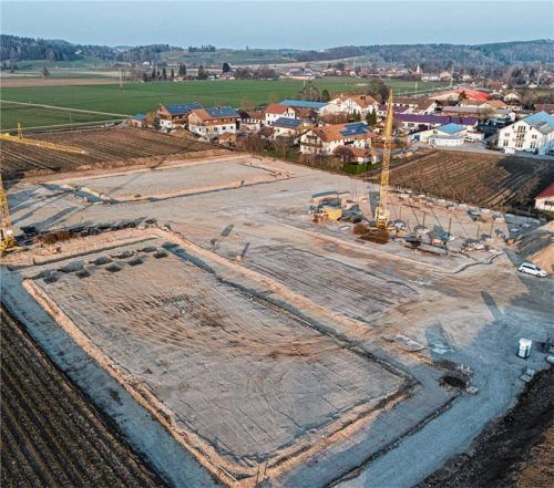 Nachdem mit den Arbeiten für die Fundamente begonnen wurde, lassen sich aus der Luft bereits die Grundrisse der drei neuen Supermärkte im Westerhamer Gewerbegebiet erkennen. Im Vordergrund entsteht der Edeka-Markt, oben in der Bildmitte der Aldi-Discounter und rechts der dmDrogeriemarkt. Laut Anschl