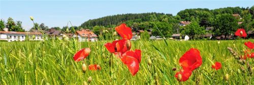 Mohn ist einfach eine Augenweide – ob im Garten oder am Feldrand wie hier in Feldkirchen-Westerham, im Hintergrund sieht man das Feldkirchener Altenheim. Die roten Tupfer blühen in allen Variationen vom wilden Mohn bis zum Türkenmohn.