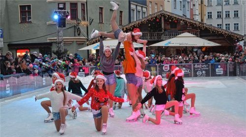 Auf dem Wasserburger Christkindlmarkt waren 18 Aiblinger Ice-Starlets voll in beziehungsweise auf ihrem Element. In der Sparkassen-Eislauf-Arena präsentierten sie eine Weihnachtsshow. Diese hatten die Mädchen eigenständig einstudiert. Als die in Shorts und Nikolausmützen zur Musik „Santa Claus is co