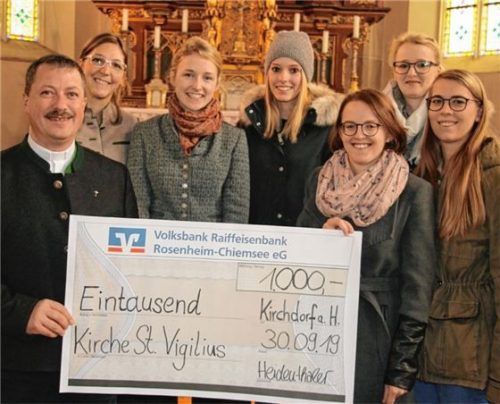 Das Dirndlfest der Kirchdorfer Dirndl im Mai war ein Erfolg. Nun überbrachten Annette Bernhofer, Sophie Winkler, Anna-Maria Heidenthaler, Franziska Schmid und Katharina Stahuber (ab Dritte von links) eine Spende von 1000 Euro für die Sanierung der Pfarrkirche St. Vigilius. Pfarrer Augustin Butaco un