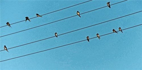 Auch für die Vögel gilt anscheinend: Etwas Abstand ist wegen Corona besser. Sie können derzeit das schöne Wetter aus ihrer luftigen und übersichtlichen Perspektive betrachten – zumindest auf diesen Stromleitungen in Ostermünchen. Foto Stache