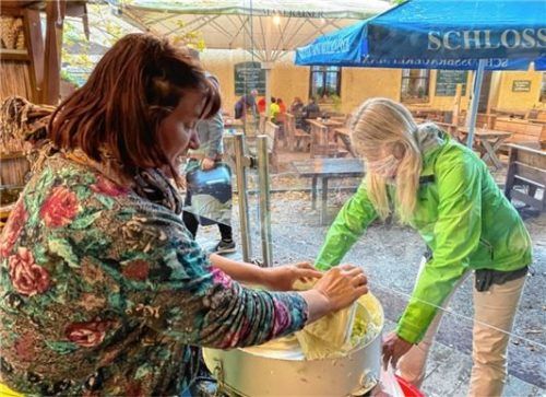 Schwört auf das selbst eingemachte Sauerkraut: Johanna Ruff aus Bad Aibling (rechts) deckt sich seit vier Jahren mit frischem Ismaninger Kraut ein.