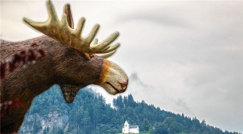 „Ich glaub’, mich knutscht ein Elch“, denkt sich das Petersbergkircherl. Der Elch steht jedoch weit unter dem Petersberg in Brannenburg auf einem Hausdach und wartet darauf, wieder für seinen nächsten Einsatz zu Weihnachten beleuchtet zu werden. Nur das Teleobjektiv der Kamera lässt ihn über den Pet