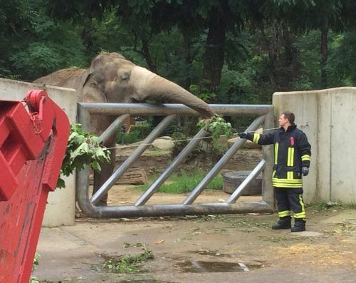 Feuerwehr macht Elefanten froh Die Augsburger Feuerwehr hat bei einem Einsatz mitgedacht und so den Elefanten im örtlichen Zoo eine kulinarische Freude gemacht. Als am Mittwoch eine Sturmböe einen Ahornbaum umknickte, verfrachteten die Feuerwehrler das Laub ins Dickhäutergehege. Denn: Elefanten lieb