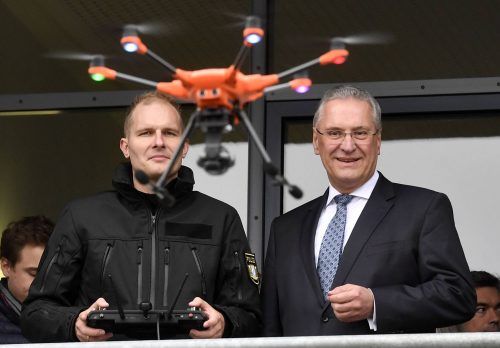 München – Die Drohne surrt wie ein Wespenschwarm – und Innenminister Joachim Herrmann lächelt gleich doppelt. Einmal live auf dem Balkon des Gebäudes der Bereitschaftspolizei – und einmal in hoher Auflösung auf dem Flachbildschirm neben ihm. Dort wird das Livebild der Kamera-Dro