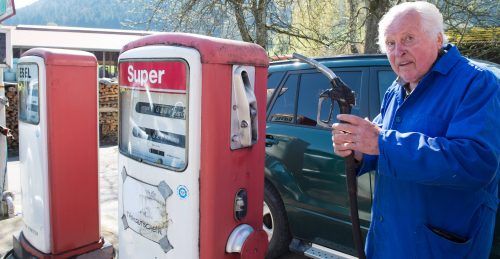 Die Sonne scheint, Hummeln brummen und Hans Huber, 87 Jahre alt, putzt die Zapfsäulen. In der einen Hand den Schwamm, in der anderen einen Striezel, der Bäcker hat gerade frisches Gebäck gebracht. Das Wasser rinnt grau an den drei Säulen hinab, einmal Diesel, zweimal Super