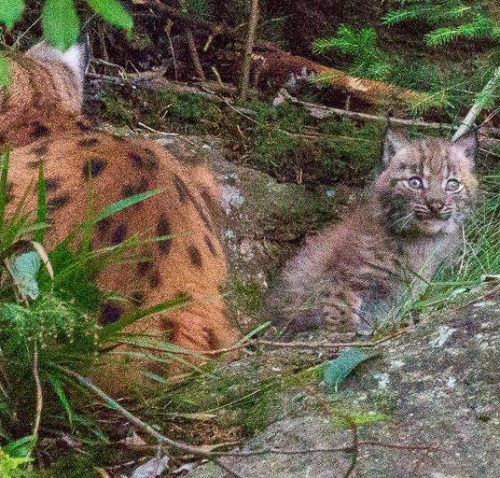 Das Luchspaar im Gehege des Nationalparkzentrums Falkenstein im Bayerischen Wald hat Nachwuchs bekommen – nur wie viele Junge es sind, können die Pfleger noch nicht sicher sagen. Zumindest ein Junges ist aber schon zu sehen, weitere Tierbabys könnten noch von der Mutter versteckt sein. Die beiden El