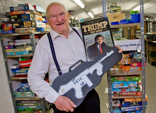 Haar – Tom Werneck geht zielsicher an drei Gängen vorbei, in den vierten biegt er ein und greift ins zweite Regal. Er zieht „Trump – The Game“ aus dem mittleren Fach, eines seiner kuriosesten Spiele. Es ist die Monopoly-Interpretation des heutigen US-Präsidenten. Rundherum: Bre