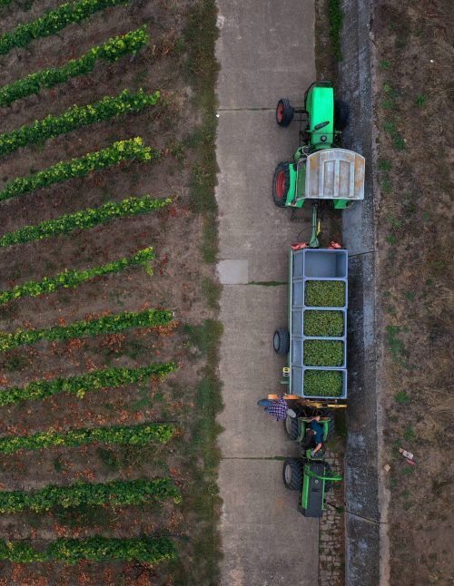 Winzer machen frisch gelesene Trauben der Rebsorte Silvaner in der Steillage „Escherndorfer Lump“ zum Abtransport bereit. Die Weinernte in Unterfranken ist in vollem Gange. Diese Aufnahme, die mit einer Drohne aus der Luft gemacht wurde, ermöglicht einmal eine andere Sicht auf die Weinlese. Foto: H