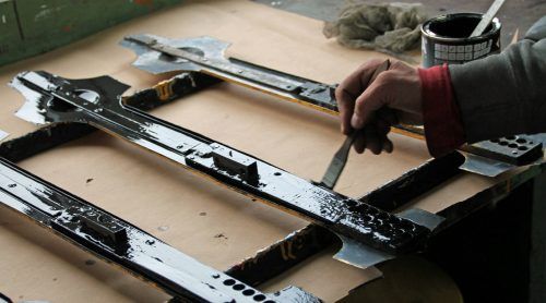 Regensburg – Eine unscheinbare Halle in einem Regensburger Hinterhof: Alexander König steht an seiner Arbeitsbank und tunkt den Pinsel in die Dose mit schwarzer Farbe. Großzügig fährt er damit über die barocken Zeiger der Großhöbinger Dorfkirche aus Mittelfranken. Rückseite schw