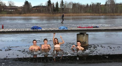 Ein bizarres Foto ist Roland Bertesch aus Burggen (Kreis Weilheim-Schongau) gelungen: Am Haslacher See bei Bernbeuren kühlten sich drei Brüder aus Altenstadt und eine junge Fau nach einem Eishockeyspiel im Eiswasser ab – während im Hintergrund ein Schlittschuhläufer seine Bahnen zieht. Ein ungewöhnl