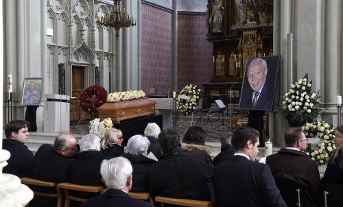 München – Direkt vor dem Altar steht der Eichen-Sarg, verziert mit cremefarbenen Rosen, rechts daneben lehnt ein großes Porträtfoto. Es zeigt Karl Denk, lachend in Anzug und Krawatte. Auf der linken Seite steht ein Gemälde, es zeigt einen Mann in einem schlichten blauen Hemd, in der