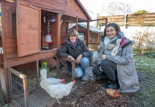 Berg – „Heute gibts kein Abendbrot mehr, Mädels“, sagt Katrin Haube. Mit Mädels meint die 56-Jährige Lotte und Erna. Die beiden Hühner leben seit 2018 bei ihrer 81-jährigen Mutter Bärbel in Berg im Landkreis Starnberg. Um die zwei Hennen für ein Foto anzulocken, gibt sie ihnen eine