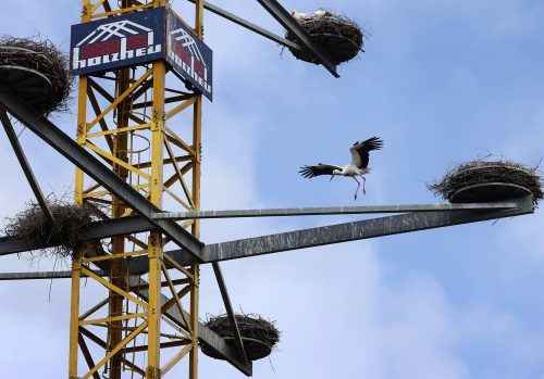 Vor einigen Jahren hat das Bauunternehmen Holzheu aus Kirchheim im Allgäu ein spezielles Stahlgestell aus einem alten Baukran aufgestellt, auf dem Platz für etwa zehn Storchennester ist. Und auch heuer wurden schon wieder eine ganze Reihe der majestätischen Vögel auf dem beliebten Nistplatz gesichte