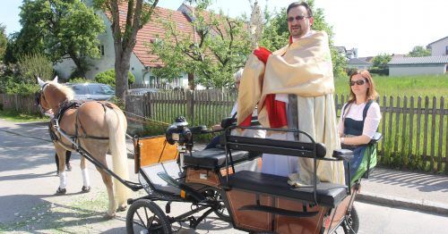 Mit der Kutsche und der Monstranz war Pfarrer Marek Bula im Erdweger Ortsteil Großberghofen (Kreis Dachau) am Fronleichnamstag unterwegs. An einen Umzug wie in normalen Jahren ist wegen der Corona-Hygienevorschriften natürlich nicht zu denken. Vor einem örtlichen Bauernhof war ein Altar aufgebaut, a