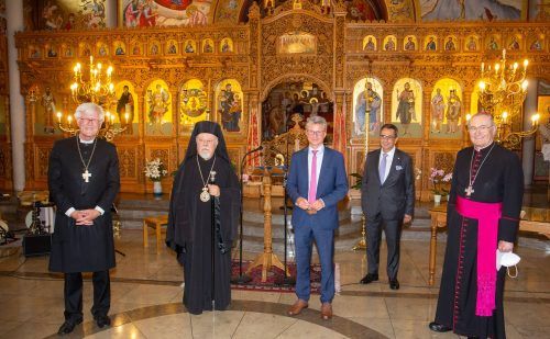 München – Der Byzantinische Kantorenchor München erfüllt die prächtige Allerheiligenkirche im Norden Münchens mit seinem kraftvollen Gesang – passende musikalische Begleitung eines Dankes für ökumenische, politische und gesellschaftliche Bande, die Griechenland und Bayern seit 2