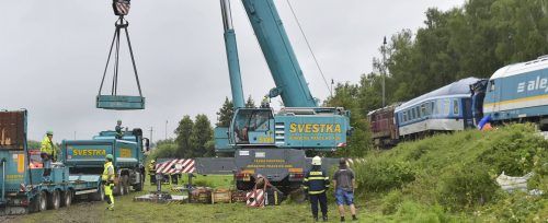 Nach der schweren Zugkollision mit drei Toten im tschechischen Grenzgebiet zu Bayern haben die Bergungsarbeiten begonnen. Gestern traf ein Kran an der Unglücksstelle ein, der die 80 Tonnen schwere Lokomotive zum Abtransport nach Deutschland auf die Gleise hieven sollte. Der Expresszug München–Prag u
