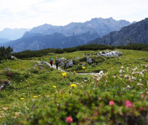 Die Bergwiesen sind voller Blumen, in der Höhe ist die Luft noch kühler und klar: Wanderer sind im Alpspitzgebiet im Kreis Garmisch-Partenkirchen unterwegs. Während es im Tal in dieser Woche von Tag zu Tag immer wärmer wird, lockt die relativ kühlere Luft in den Bergen zu entspannten Wanderungen. Ab