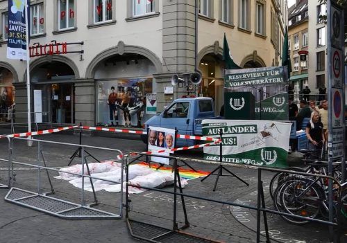 Würzburg/München – Drei Strohpuppen unter Planen, beschmiert mit Kunstblut, davor ein Plakat mit den Fotos der drei Kanzlerkandidaten und im Hintergrund die Parole „Volksverräter“ – so martialisch demonstrierte die neonazistische Kleinstpartei „Der Dritte Weg“ mit 20 Sympathisanten am Samstag in der