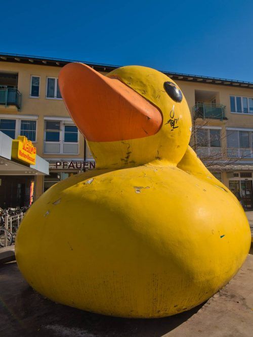 Unterhaching – Noch ist der „Teich“ leer, aber fest steht: Die riesige gelbe Ente, ein Kunstwerk von Wolfgang Flatz und seit 25 Jahren Markenzeichen des Fasanenpark-Einkaufszentrums (FEZ) in Unterhaching, kehrt demnächst wieder an ihren Platz zurück. Nachdem Wasser und Frost ihr schwer zugesetzt hat