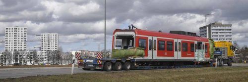 Vorbei an den Hochhäusern auf dem ehemaligen Siemens-Gelände im Münchner Süden schleppt ein Tieflader das vordere Teil einer der beiden S-Bahnen, die vor einer Woche bei Schäftlarn (Kreis München) kollidiert waren. Bei dem Unfall war ein 24-Jähriger gestorben, 18 Personen wurden verletzt. Die Streck