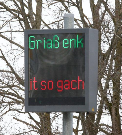 Die Gemeinde Rottenbuch (Kreis Weilheim-Schongau) greift auf eine ungewöhnliche Maßnahme zur Verkehrsberuhigung zurück. Im Ort gibt es zwei digitale Anzeigen, auf denen die Autofahrer zu angepasster Geschwindigkeit ermahnt werden – zum Tag der Muttersprache nun im Dialekt. Mit „Griaß enk“ (Grüß euch