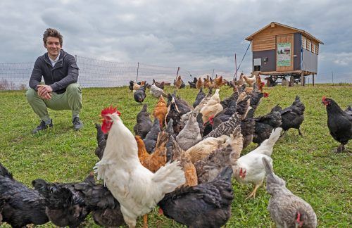 Ingelsberg – Schwarz-blau schimmernd, weiß, graugescheckt: 140 Hühner picken und scharren um Lukas Höger im Gras herum. In Ingelsberg im Landkreis Ebersberg hat der 25-Jährige vor zwei Jahren eine sogenannte Mikrofarm aufgebaut. Seit diesem Jahr neu dabei: ein zweiter Hühne
