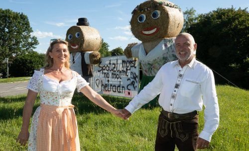 Starnberg – Viele Autofahrer wunderten sich bereits über den ungewöhnlichen Heiratsantrag: Am Straßenrand von Perchting (Starnberg) hält ein Paar aus Strohballen ein Transparent hoch: „Spotzl, mogst mi no moi heiradn?“ Dieser Antrag gilt Elke Hladik (63). Ungewöhnlich: Sie ist