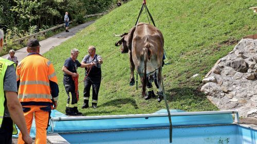 Kuh stürzt in Swimmingpool