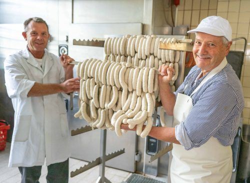 Rottach-Egern – Es ist fast Mittag und riecht nach Geräuchertem. Auf einer Stellage werden frische Weißwürste hereingefahren. Heinz Waldenmaier streift sich die Hände an seiner weißen Gummischürze ab und rückt die weiße Kappe zurecht. Die Ärmel an seinem weiß-blau gestreiften Hemd