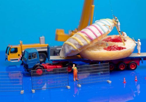 Dachau – Dieter Isemann sitzt in seinem Wohnzimmer und hantiert mit einer Pinzette an einem aufgeschnittenen Donut herum. Zwei Marmeladen-Klekse hat er bereits perfekt darauf arrangiert. Nun platziert der 62-Jährige kleine Bauarbeiter rund um den Donut. Dessen obere Hälfte wird g