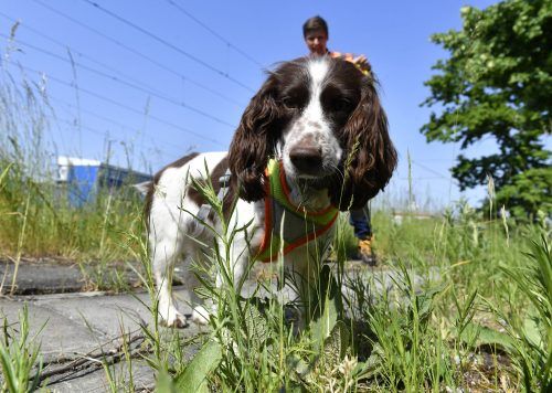 München – Max Bültge steht mit seiner Hündin Finya, drei Jahre alt, im kniehohen Gras auf einem Bahngelände in München unweit der Donnersbergerbrücke. Pralle Sonne, der Cocker-Springerspaniel hechelt schon. Es muss jetzt schnell gehen: Länger als zehn, maximal 20 Minuten kann der Vi