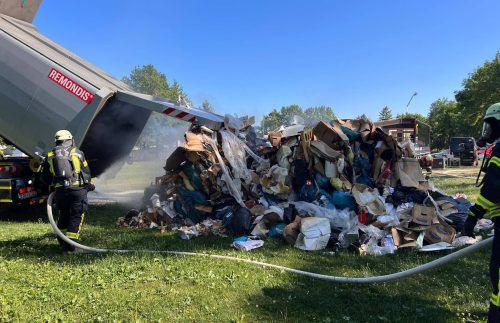 Eichenried – Feuerwehreinsatz bei einem Golfturnier in Eichenried (Landkreis Erding): Weil sich am Sonntagnachmittag der Inhalt einer nahezu vollen Müllpresse entzündet hatte, rückten die Einsatzkräfte aus Altenerding und Eichenried zum Golfplatz aus. Eine Zugmaschine nahm die Presse huckepack, fuh