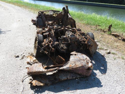 Mit Tölzer Kennzeichen: Wrack eines Zweitürers, Baujahr um 1962, aus der Donau geborgen