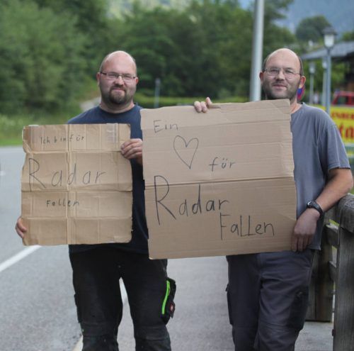 Marktschellenberg – Raser haben Grund zur Freude: Seit Monaten stehen die Zwillinge Tobias und Markus Anzenberger aus Berchtesgaden mit beschrifteten Pappdeckeln an viel befahrenen Straßen und warnen vor Blitzern. Wer zu schnell dran ist, bremst. Verkehrsüberwachern sind bei der kuriosen Aktion die