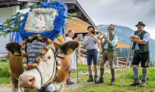 Für die Rinder der unteren Firstalm im Spitzingseegebiet ist der Almsommer vorbei. Jetzt geht es heim zum Kirchbergerhof in Fischhausen. Und damit der Almabtrieb für die festlich geschmückten Tiere trotz der vielen Zuschauer nicht so stressig ist, wurden sie vor dem Start mit ein wenig Blasmusik ber