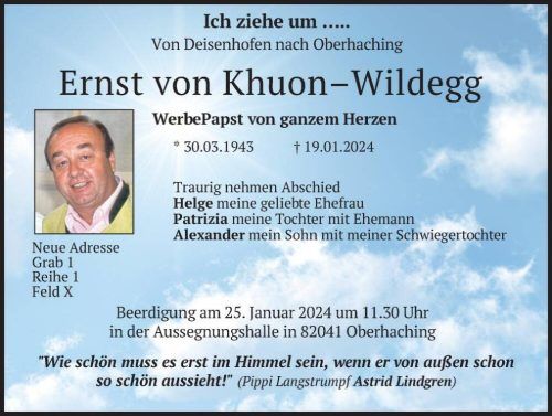 Deisenhofen – Reihe 1, Grab 1. Hier am Friedhof in Oberhaching ruht fortan der „Werbe-Papst“. „Ich ziehe um, von Deisenhofen nach Oberhaching“, verkündete Ernst von Khuon-Wildegg gestern in mehreren Zeitungen. Der Verstorbene lacht auf einem Foto von seiner Todesanzeige, die So
