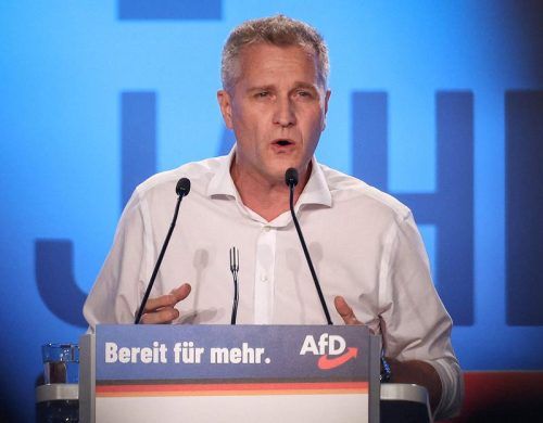 „Bisher keine Beweise“: Petr Bystron, hier bei einer Rede in Magdeburg, wird von der AfD verteidigt. © Hartmann / AFP