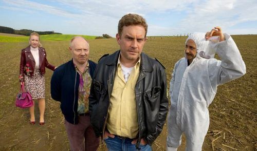 Skurriler Mordfall auf dem Feld: Die Szene aus dem neunten Eberhofer-Film „Rehragout-Rendezvous“ zeigt Sebastian Bezzel als Dorfsherrif von Niederkaltenkirchen. Links im Hintergrund seine Frau Susi, gespielt von Lisa Maria Potthoff. © Co