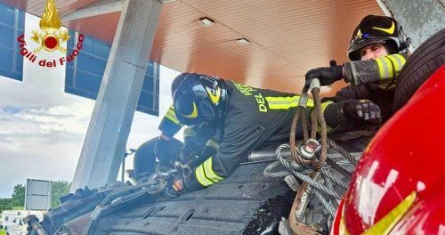 Italienische Einsatzkräfte an einem Auto, das beim Aufprall aufs Dach geschleudert wurde. © dpa