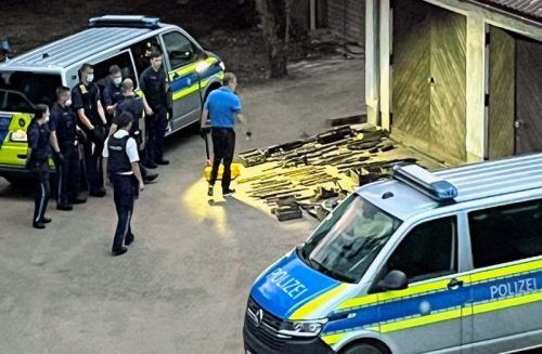Das Waffen-Arsenal liegt ausgebreitet vor dem Schuppen, den die Polizei am Donnerstagabend ausräumte. © mm