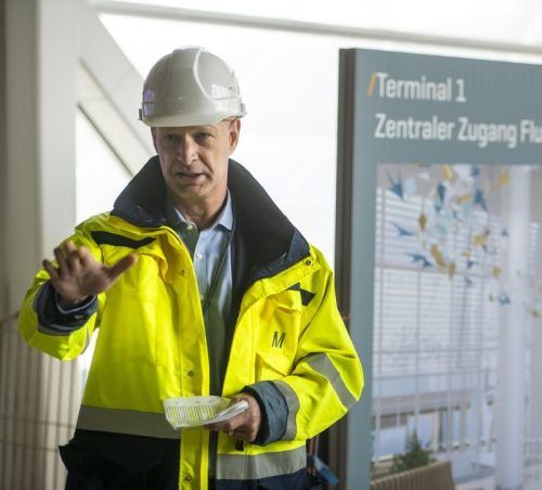 Vor-Ort-Termin im Rohbau: Flughafen-Chef Jost Lammers erwartet die Inbetriebnahme im Frühjahr 2026.