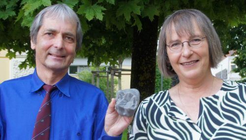 Das ist der Backenzahn in siebenfacher Vergrößerung: Hobby-Archäologe Manfred Schmid und die Professorin Madelaine Böhme zeigen eine Replik. © Hirschberg