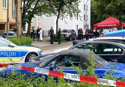 Der Tatort in Milbertshofen: Polizeibeamte stehen Anfang Juni vor einem Mehrfamilienhaus. © dpa