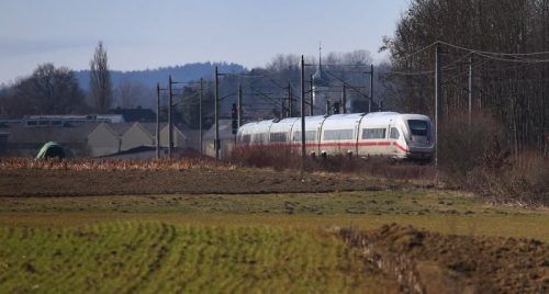 Ein ICE rauscht auf der 170 Jahre alten Strecke Augsburg-Ulm an Diedorf vorbei. Künftig würde er auf der Neubaustrecke fahren, und das wesentlich schneller als derzeit möglich. © Karl-Josef Hildenbrand/dpa