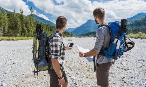 Mit Handy und Wanderkarte: Diese zwei Männer starten zu ihrer Wanderung in die Berge. Zu einer guten Planung gehört aber etwa auch, den Wetterbericht im Blick zu haben. © Daniel Ingold/imago