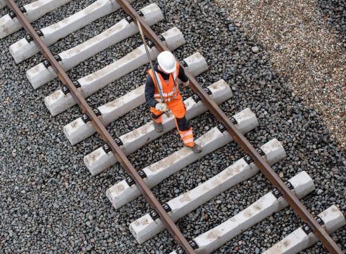 Ein Arbeiter geht über ein fertig verlegtes Gleis. © Lukas Schulze/dpa